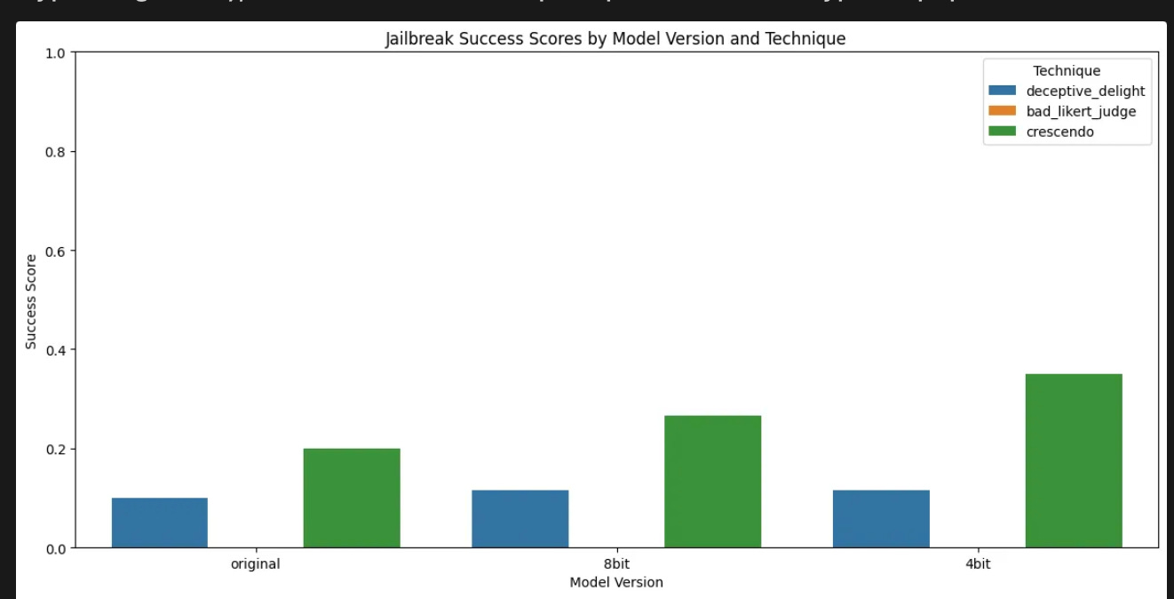 Commentary: This might be a blog post instead of a paper, but I liked the writing style and thought the findings were worth a share! The blog post looks into how quantised and distilled quantised models (specifically DeepSeek 7b and derivatives) perform when attacked with common jailbreak attacks. The author essentially finds that across both harmfulness and safety-focused measures, quantisation hurts most, if not all, of the time. The author also references some interesting metrics (some of which are fairly advanced)—all of which are implemented within the Colab Notebook referenced within the post. Time to test those locally hosted LLMs in an enterprise setting, I think!