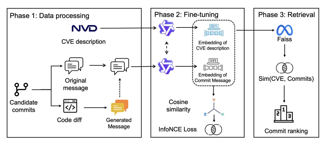 Commentary: This paper focuses on solving a key challenge when building source code level datasets for CVEs, when the CVE record does not have an explicitly linked Vulnerability Fixing Commit (VFC). The approach itself is broken into three stages. The first stage is fairly workaday bar a twist and focused on generating the dataset. The authors use a commit or change pre-trained model to generate a commit message for each code diff of candidate commits. This overcomes the common use of “quick fix” as the commit message and instead provides more detail. This generated commit is added to the original. The CVE description and this juiced-up commit message are then used to fine-tune a Qwen3 variant contrastively to map CVE descriptions → commit messages. The last stage is standard information retrieval. There are also a few additional tricks used, such as fancy sampling, which is described in section 4.5.