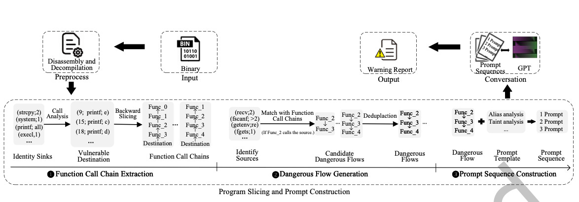 The approach uses decompiled code generated by Ghidra and iteratively processes it with an LLM (GPT-4) to complete end-to-end taint analysis. The first phase of this approach is creating Function Call Chains whereby the authors use an LLM to automatically identify sinks before then using backward slicing to create the function call chain to an external function. These Function Call Chains are then further analysed by the LLM to identify which can be classified as dangerous flows. The identified dangerous flows are then refined further and put into a defined prompt template before being analysed by the LLM one last time. The authors do a great job at digging into the detail of all of the 3 steps above—I definitely have not done it justice! The hands-off, non-expert-level knowledge requirement for this approach makes it attractive and feels like it could be generalised somewhat.