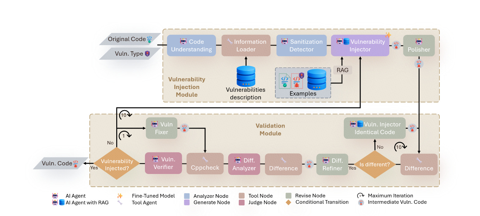Commentary: The premise of this paper is pretty interesting. It focuses on creating high-quality datasets for source code-based vulnerability detection models by using LLMs to inject bugs into non-buggy code (there is some meta-problem here around how they know it's not already buggy, but we'll skip over that!). The method uses a series of agents (which don’t really seem like agents to me, more of a workflow) that contextualise input code and then add bugs into it.