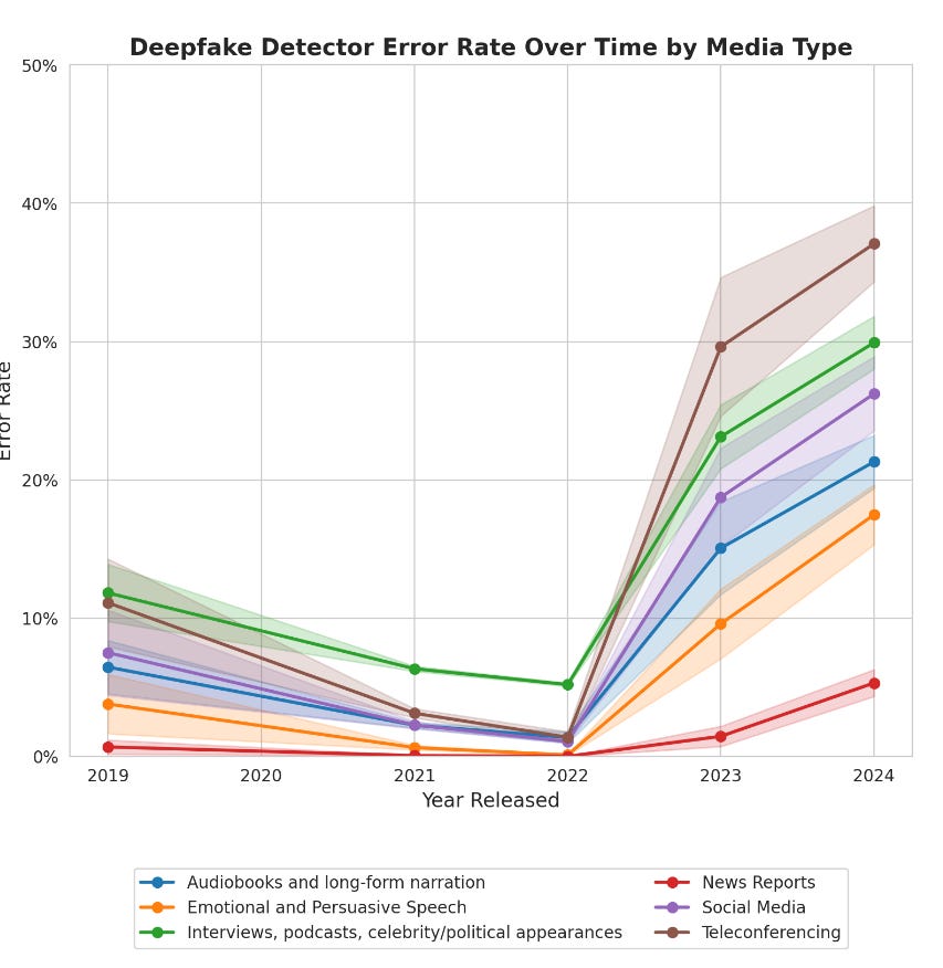 A picture speaks a thousand words, as they say. The below plot is Figure 2 from the paper and shows mean Equal Error Rate (EER). I was unfamiliar with the metric and misinterpreted this graph when I first looked at it. I thought, “Oh, the detectors got much better in 2023 and 2024!” but it’s actually the opposite; they started getting much worse.
