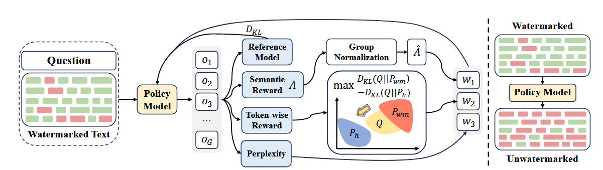 The method itself is an RL based approach that uses a combined reward function that is used to fine-tune a model to paraphrase/re-word a given watermarked input whilst still preserving semantic fidelity. The authors show that this can be done with a very small dataset (100 examples in the paper’s case). The method is basically trained to do undetectable plagiarism. The results section speaks for itself – models fine-tuned using this approach are very good at this task, like, really good, with an evasion success rate (ESR) of 90%+.