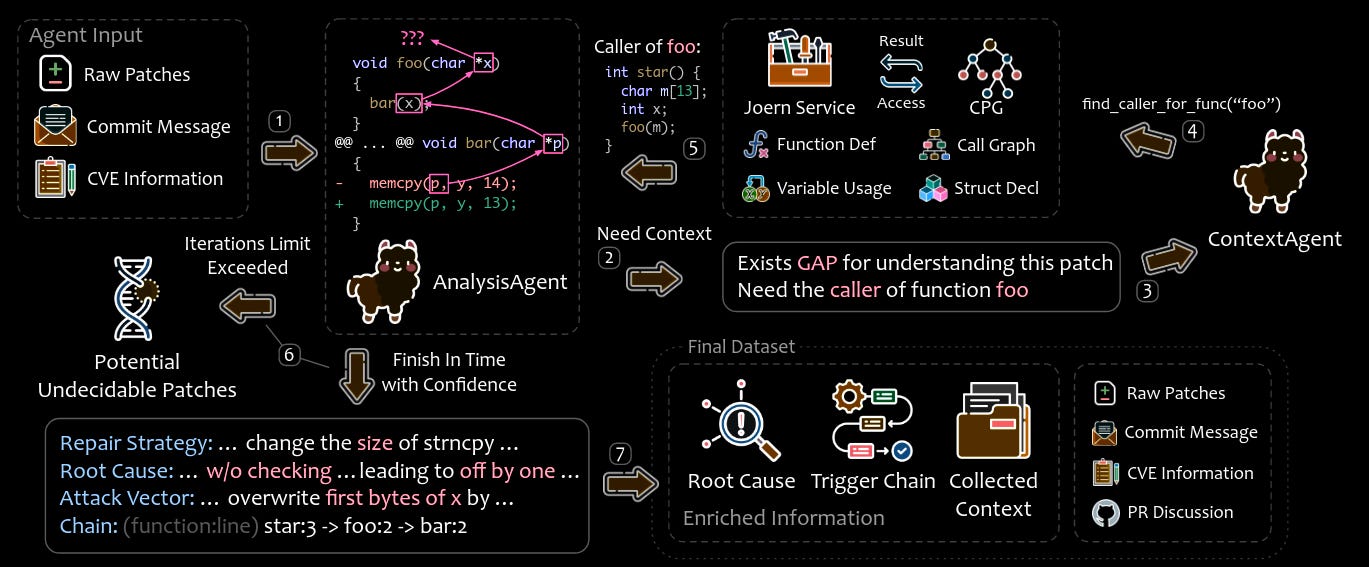 Commentary: This paper has two main parts. The first is focused on filtering patches. The general idea here is that, due to the automated approach used when creating large vuln datasets, some of the patches are likely benign and not actually fixing any security vulnerability. The authors add PR discussion content alongside the raw patch and commit message. I think this approach is good but definitely not foolproof. There is a lot of nuance here which is being passed off to an LLM without that much prior thought. I can’t think of any specific examples off the top of my head, but it is not unheard of for folks to patch security vulnerabilities with commit messages that look benign and little to no PR chatter! The next stage is a multi-agent LLM system which iteratively processes the vulnerability to identify the root cause and relevant metadata. The output of which is a yay or nay for if the vulnerability should be included in the final dataset.